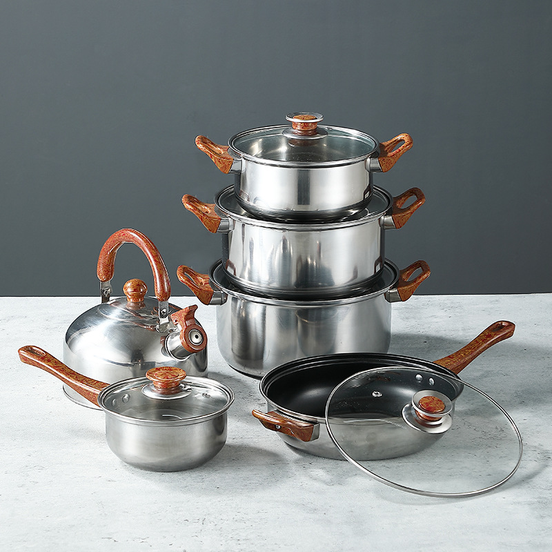 12-piece Set With Wood Grain Handle And Kettle/frying Pan-uncoated Liner