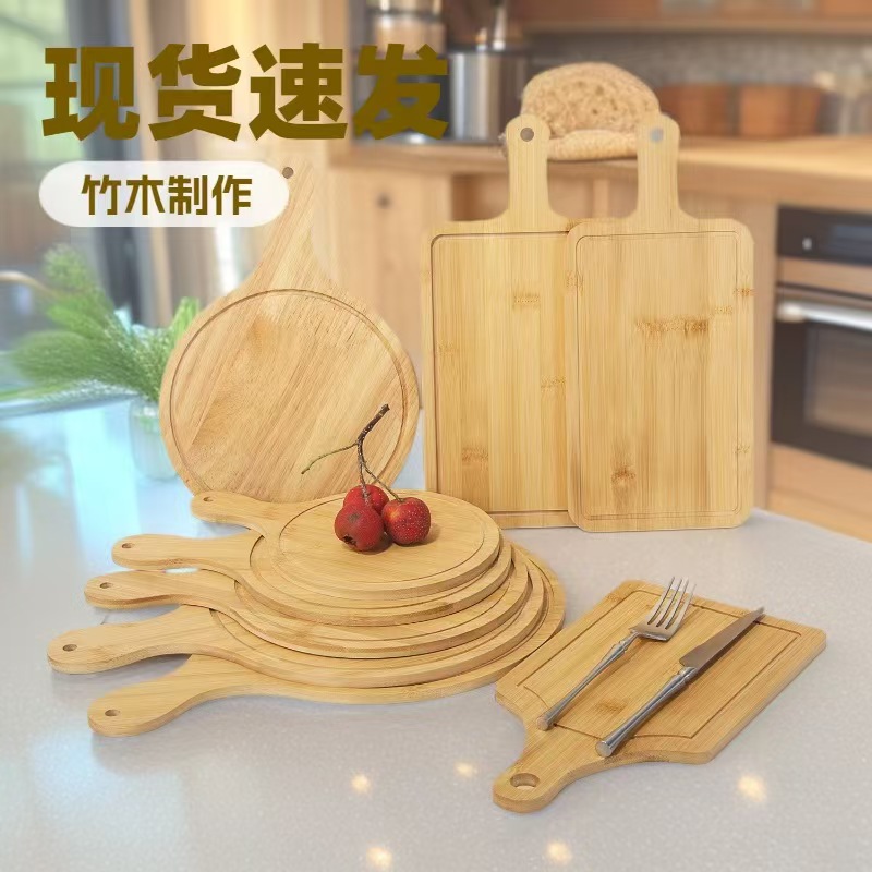 In Stock Wooden Round Pizza Tray, Bread And Dessert Platter, Solid Wood Steak Plate With Handle, Sushi And Cake Serving Tray.