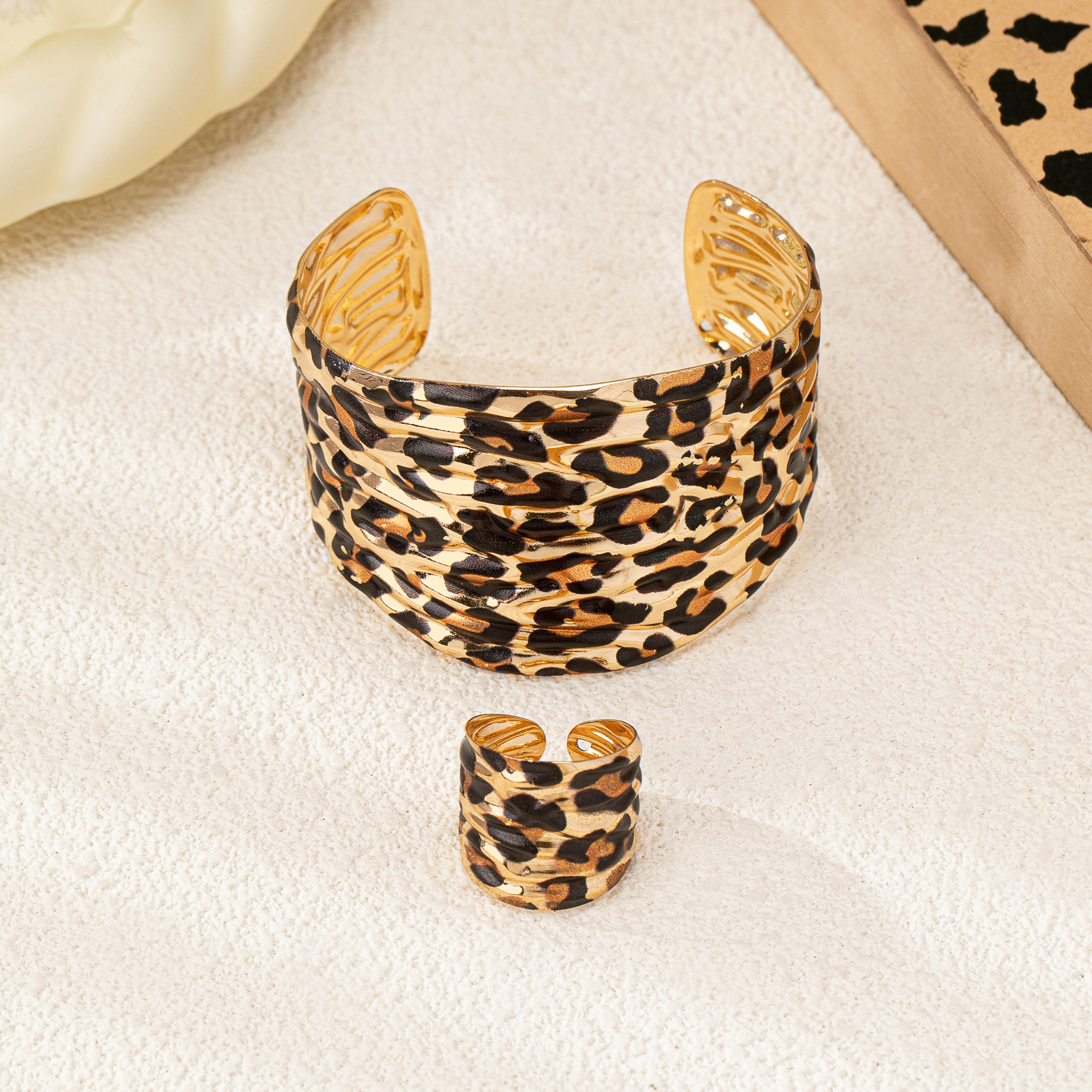 Cross-border Hot Personality Exaggerated Jewelry Leopard Print Geometric Irregular Bracelet Ring Two-piece Set Suitable For Party